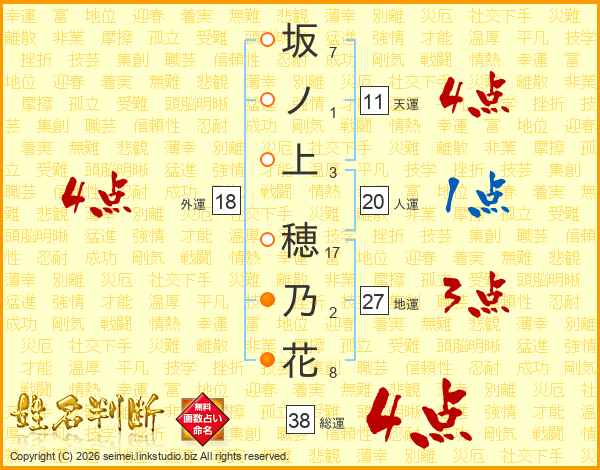 坂(7画)ノ(1画)上(3画) 穂(17画)乃(2画)花(8画)