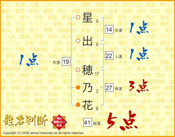星(9画)出(5画) 穂(17画)乃(2画)花(8画)