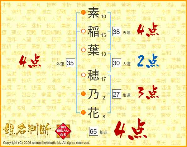 素(10画)稲(15画)葉(13画) 穂(17画)乃(2画)花(8画)