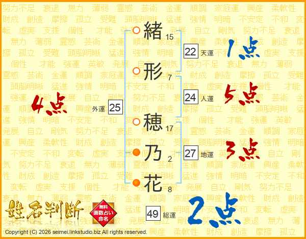 緒(15画)形(7画) 穂(17画)乃(2画)花(8画)