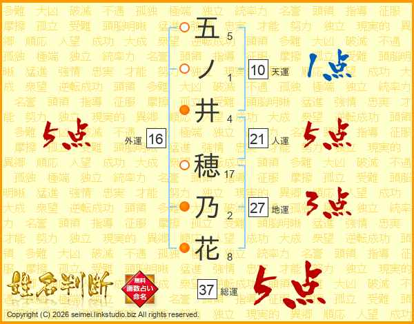 五ノ井穂乃花さんの総運は37画の5点!