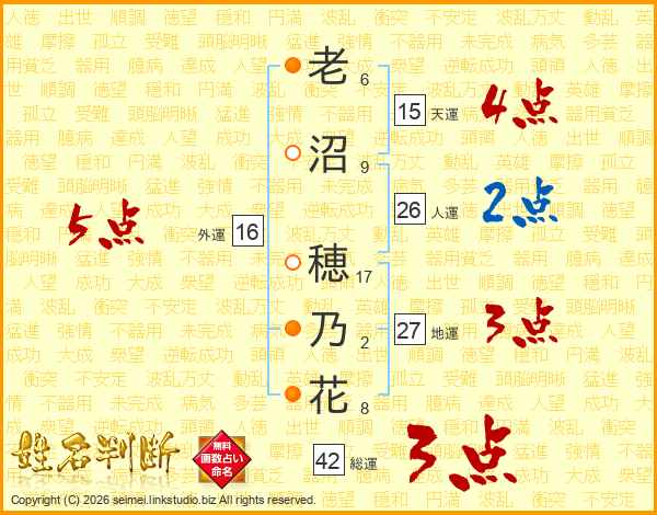 老(6画)沼(9画) 穂(17画)乃(2画)花(8画)