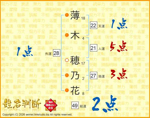 薄(18画)木(4画) 穂(17画)乃(2画)花(8画)