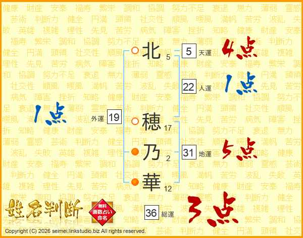 生活面を象徴する運勢です。外部から受ける影響力を表し、結婚運、家庭運や職場、環境への順応性を表します。総運から人運を引いた画数。姓や名が1文字の場合を除く。