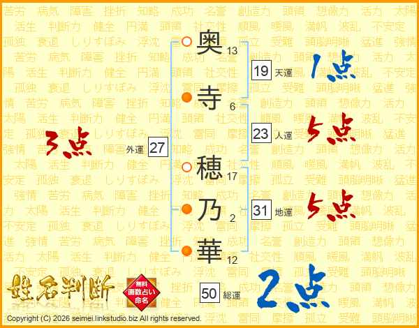奥(13画)寺(6画) 穂(17画)乃(2画)華(12画)
