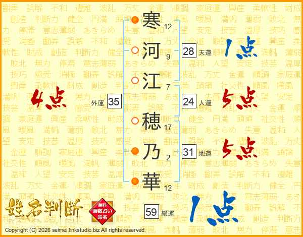寒(12画)河(9画)江(7画) 穂(17画)乃(2画)華(12画)