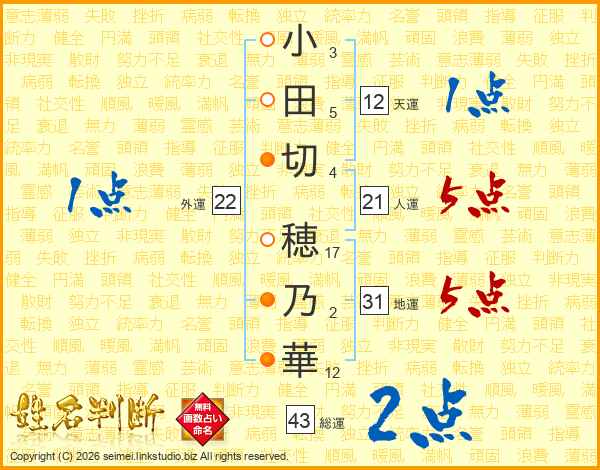 小田切穂乃華さんの総運は43画の2点!