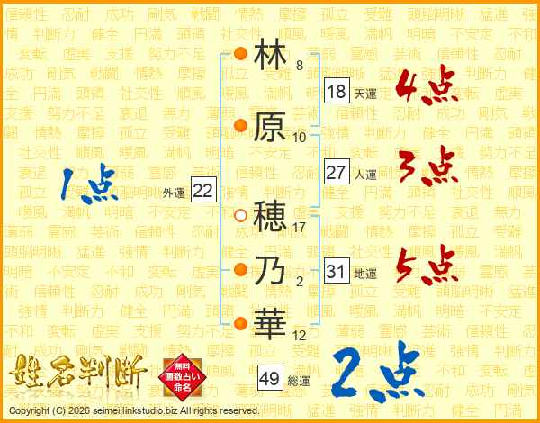 林(8画)原(10画) 穂(17画)乃(2画)華(12画)