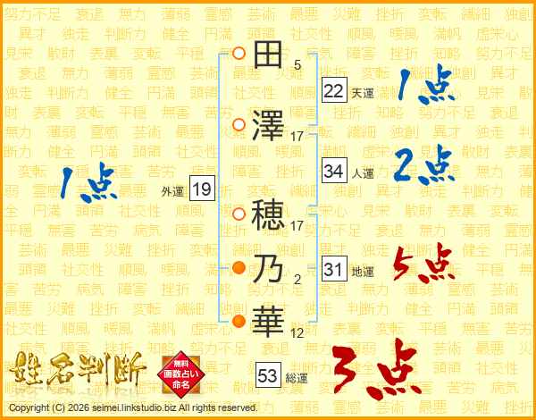 田(5画)澤(17画) 穂(17画)乃(2画)華(12画)