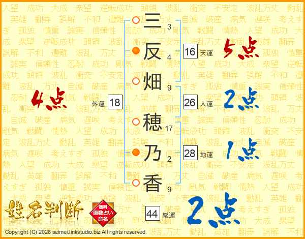 三(3画)反(4画)畑(9画) 穂(17画)乃(2画)香(9画)