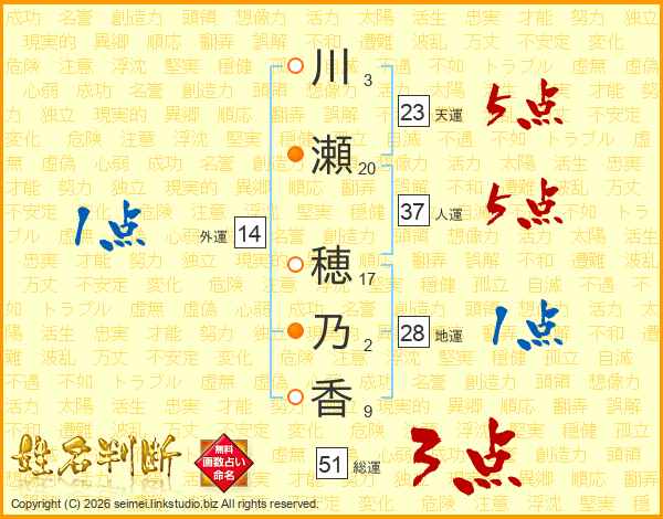 川(3画)瀬(20画) 穂(17画)乃(2画)香(9画)