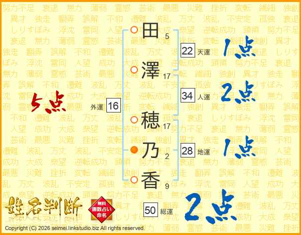 田(5画)澤(17画) 穂(17画)乃(2画)香(9画)