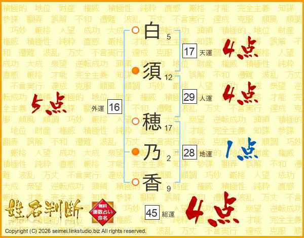 白(5画)須(12画) 穂(17画)乃(2画)香(9画)