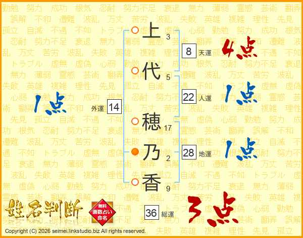 上(3画)代(5画) 穂(17画)乃(2画)香(9画)