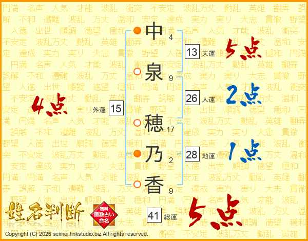 中(4画)泉(9画) 穂(17画)乃(2画)香(9画)