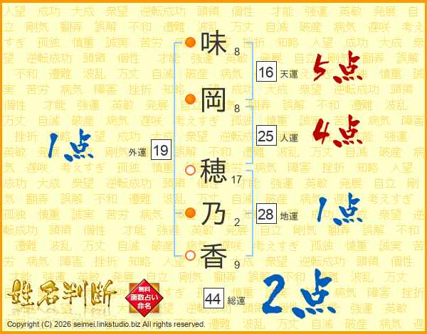 味(8画)岡(8画) 穂(17画)乃(2画)香(9画)