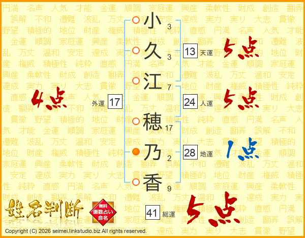 小(3画)久(3画)江(7画) 穂(17画)乃(2画)香(9画)