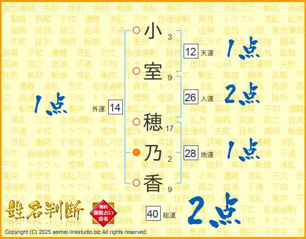 小(3画)室(9画) 穂(17画)乃(2画)香(9画)
