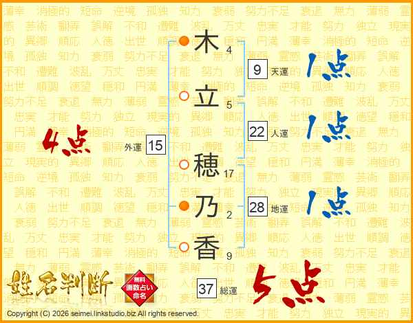 木(4画)立(5画) 穂(17画)乃(2画)香(9画)