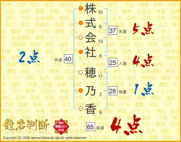 株(10画)式(6画)会(13画)社(8画) 穂(17画)乃(2画)香(9画)