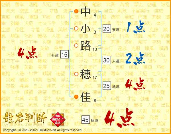 中(4画)小(3画)路(13画) 穂(17画)佳(8画)