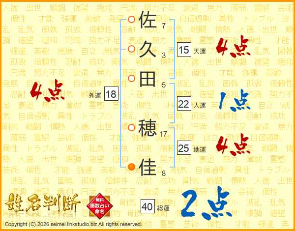 佐(7画)久(3画)田(5画) 穂(17画)佳(8画)