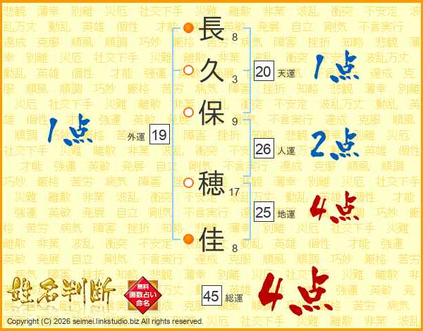 長(8画)久(3画)保(9画) 穂(17画)佳(8画)