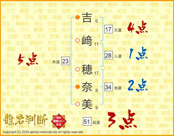 吉(6画)﨑(11画) 穂(17画)奈(8画)美(9画)