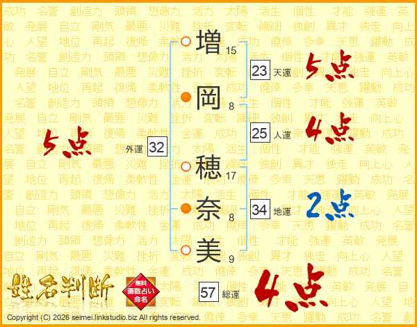 増(15画)岡(8画) 穂(17画)奈(8画)美(9画)