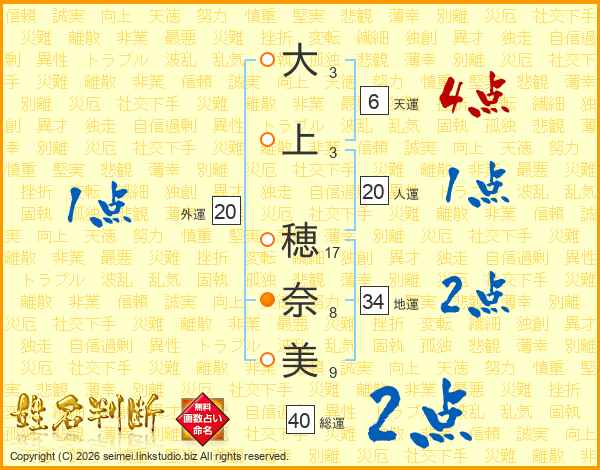大(3画)上(3画) 穂(17画)奈(8画)美(9画)