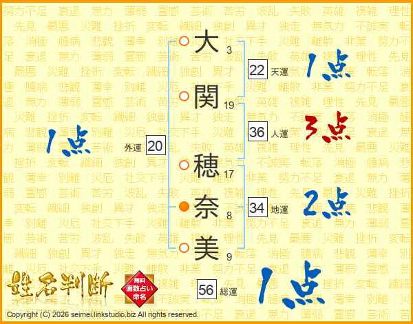 大(3画)関(19画) 穂(17画)奈(8画)美(9画)