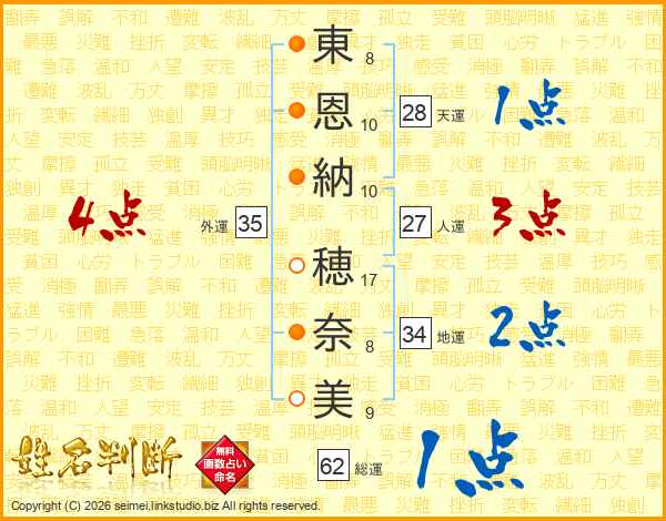 東(8画)恩(10画)納(10画) 穂(17画)奈(8画)美(9画)