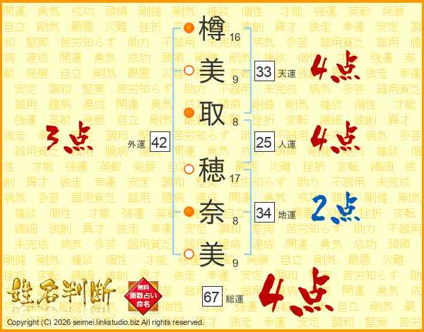 樽(16画)美(9画)取(8画) 穂(17画)奈(8画)美(9画)