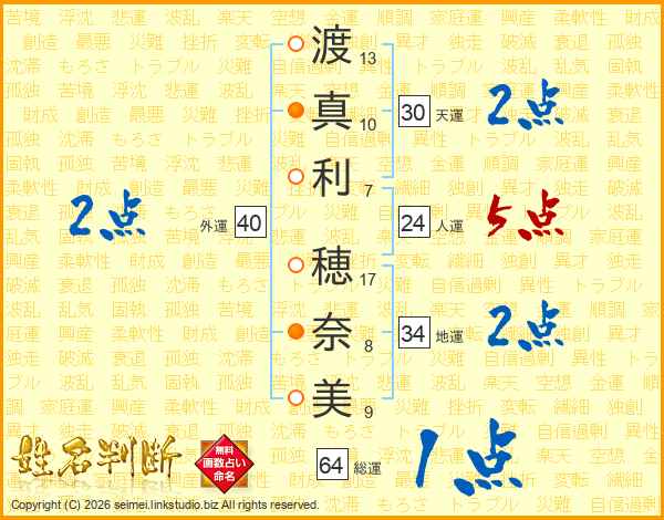 渡(13画)真(10画)利(7画) 穂(17画)奈(8画)美(9画)