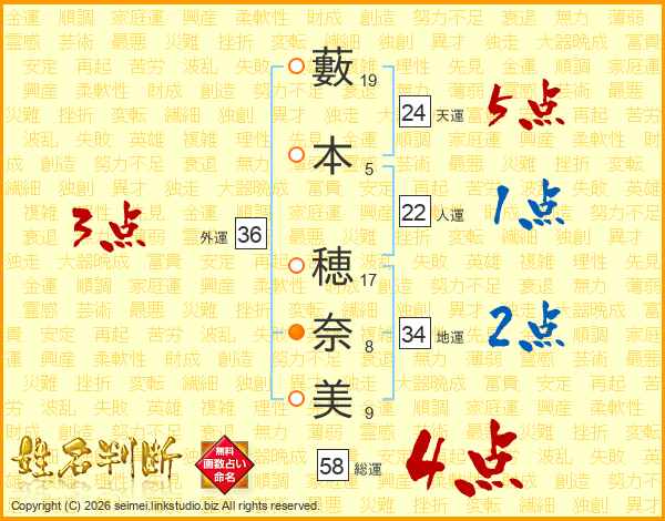 藪本穂奈美さんの天運は24画の5点!