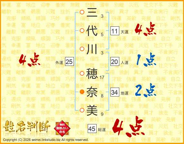 三(3画)代(5画)川(3画) 穂(17画)奈(8画)美(9画)