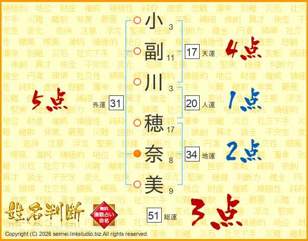 小(3画)副(11画)川(3画) 穂(17画)奈(8画)美(9画)