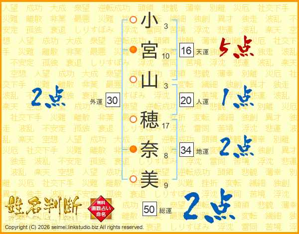 小(3画)宮(10画)山(3画) 穂(17画)奈(8画)美(9画)