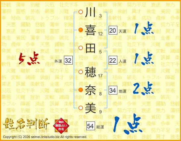 川(3画)喜(12画)田(5画) 穂(17画)奈(8画)美(9画)