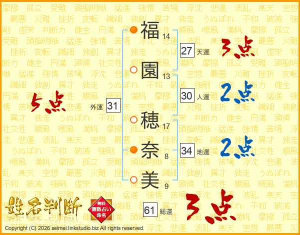 福(14画)園(13画) 穂(17画)奈(8画)美(9画)