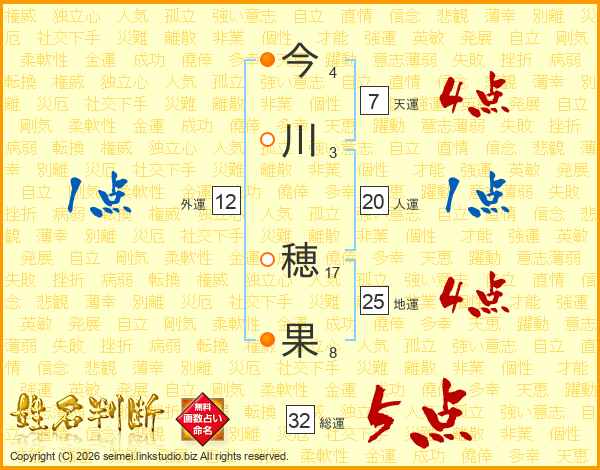 生活面を象徴する運勢です。外部から受ける影響力を表し、結婚運、家庭運や職場、環境への順応性を表します。総運から人運を引いた画数。姓や名が1文字の場合を除く。