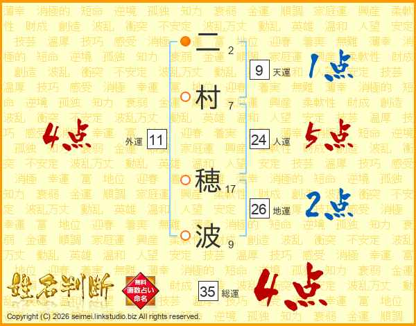 生活面を象徴する運勢です。外部から受ける影響力を表し、結婚運、家庭運や職場、環境への順応性を表します。総運から人運を引いた画数。姓や名が1文字の場合を除く。