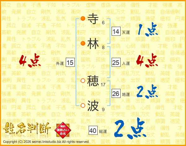 寺(6画)林(8画) 穂(17画)波(9画)