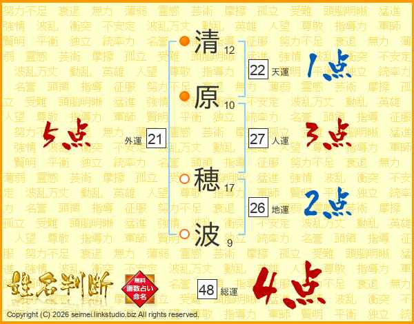 生活面を象徴する運勢です。外部から受ける影響力を表し、結婚運、家庭運や職場、環境への順応性を表します。総運から人運を引いた画数。姓や名が1文字の場合を除く。