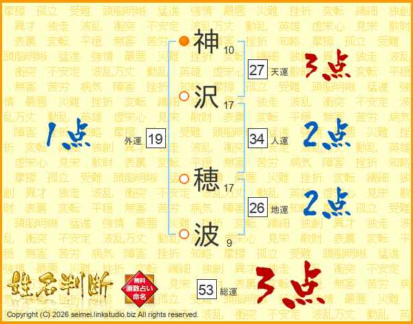生活面を象徴する運勢です。外部から受ける影響力を表し、結婚運、家庭運や職場、環境への順応性を表します。総運から人運を引いた画数。姓や名が1文字の場合を除く。