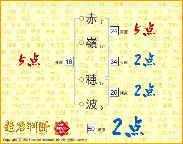 赤(7画)嶺(17画) 穂(17画)波(9画)