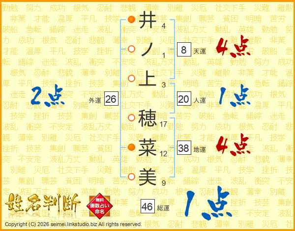 井(4画)ノ(1画)上(3画) 穂(17画)菜(12画)美(9画)