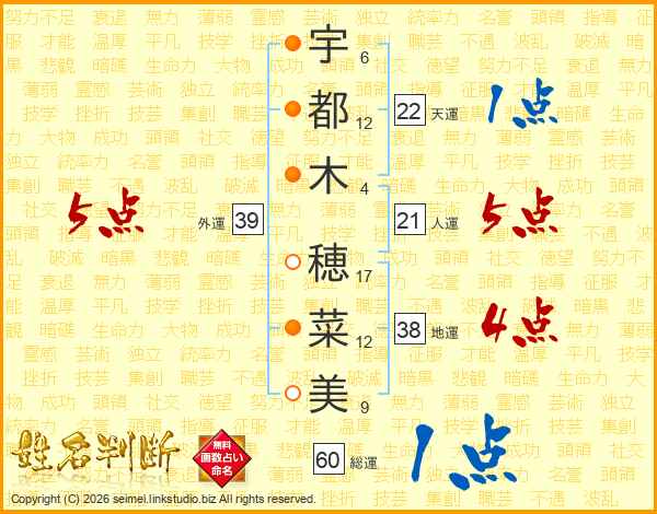 宇(6画)都(12画)木(4画) 穂(17画)菜(12画)美(9画)