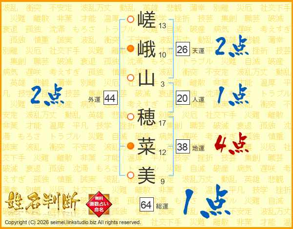 嵯(13画)峨(10画)山(3画) 穂(17画)菜(12画)美(9画)