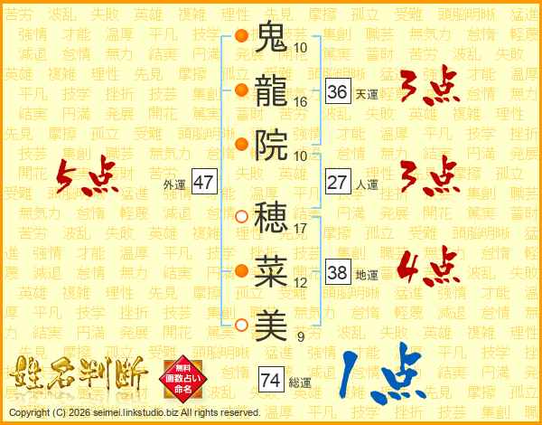 鬼(10画)龍(16画)院(10画) 穂(17画)菜(12画)美(9画)